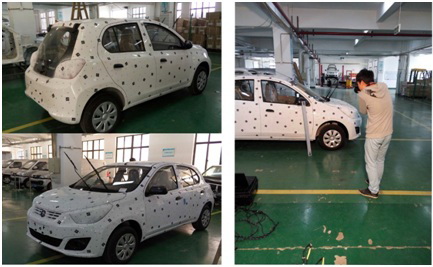 流程: 以下圖掃描整車為例,首先,為整車布點(diǎn),并用全局?jǐn)z影測(cè)量系統(tǒng)獲取標(biāo)記點(diǎn)的空間三維數(shù)據(jù)。